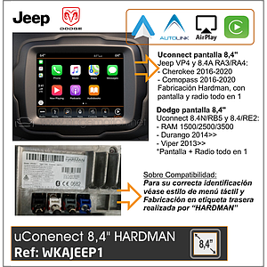 Kit Car-Play + Android-Auto + Mirror-Link + Visión 180º + USB Media JEEP/DODGE uConnect 8.4" Hardman (2015-2020)